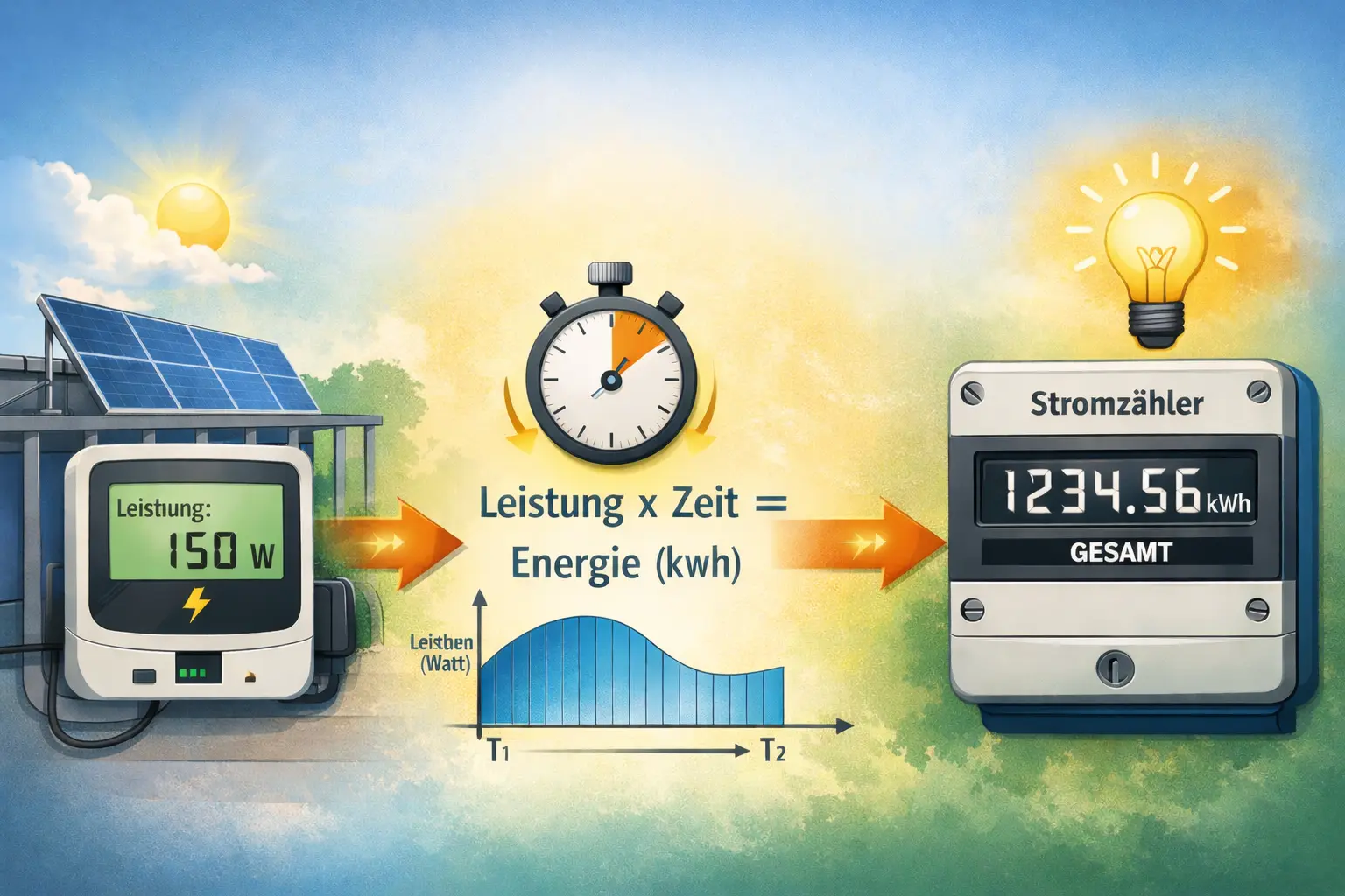 - Schließlich kann die Energie in Wattstunden berechnet werden.