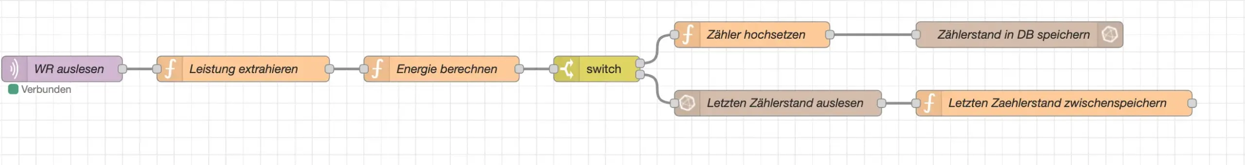 In der Funktion „Energie berechnen” ermittele ich die Energie im letzten Zeitintervall. Mit dem anschließenden Switch-Node teste ich, ob die Variable „f_Zaehlerstand” vorhanden ist (Bedingung für Ausgang 1: „ist nicht Null”, für Ausgang 2: „ansonsten”). Warum mache ich das?
